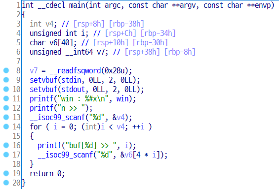 n을 크게 입력하면 반복문 입력을 하면서 bof가 발생하는 것을 볼 수 있다.