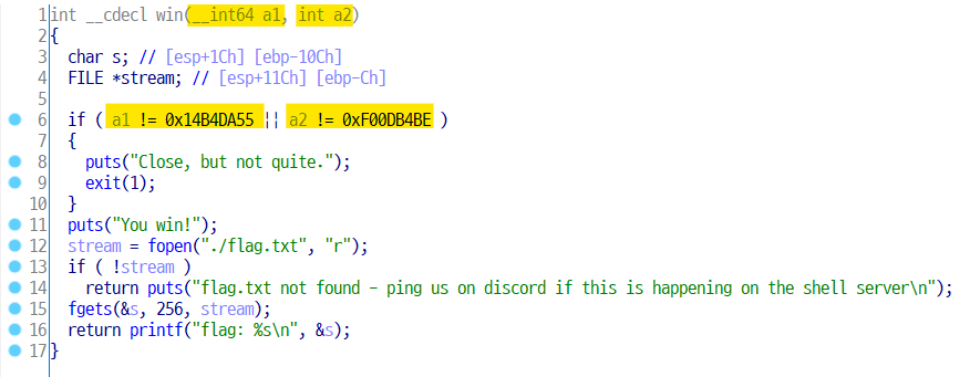 이번에는 ret를 win으로 덮기만해서는 안되고 위에있는 인자를 덮어줘야할 필요가 있다.