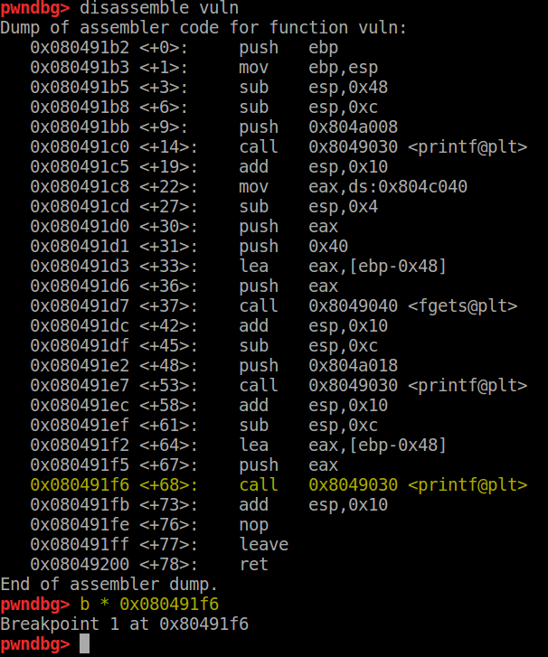그리고 포맷스트링 직전 인자값들을 확인하기 위해 FSB가 일어나는 printf 직전에 breakpoint를 걸어준다.