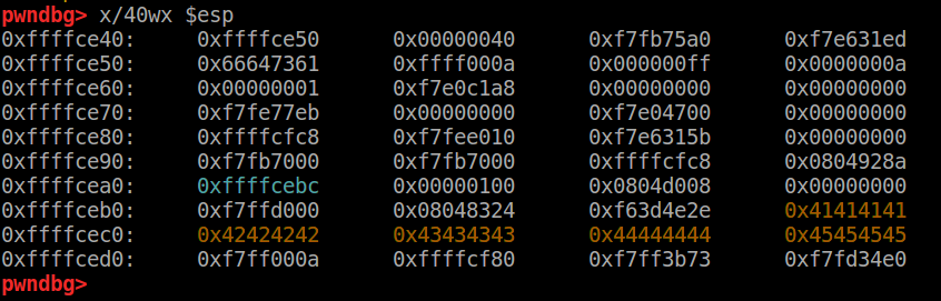 사진과 같이 파란색 0xffffcebc 위치에 우리가 입력한 AAAA... flag.txt파일이 적혀있는 것을 볼 수 있다.