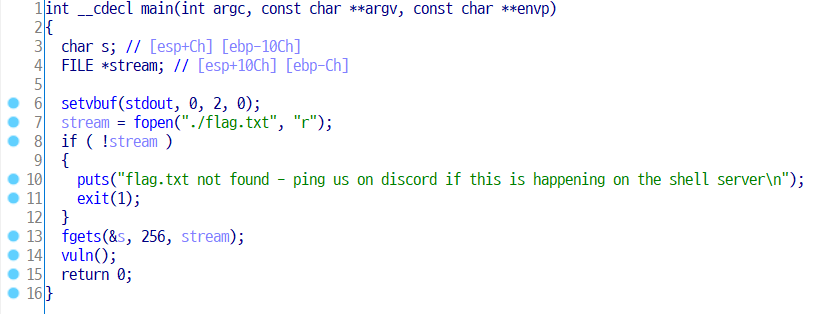 처음 main()함수에서 flag파일을 읽어와 s에 적어준 뒤, vuln(); 함수를 실행시킨다.