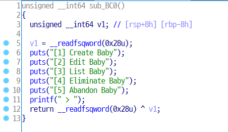 이 때 read(0, *v3, 0x68)을 하는 과정에서 off by one이 발생하게 된다.