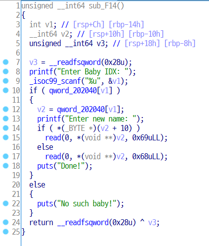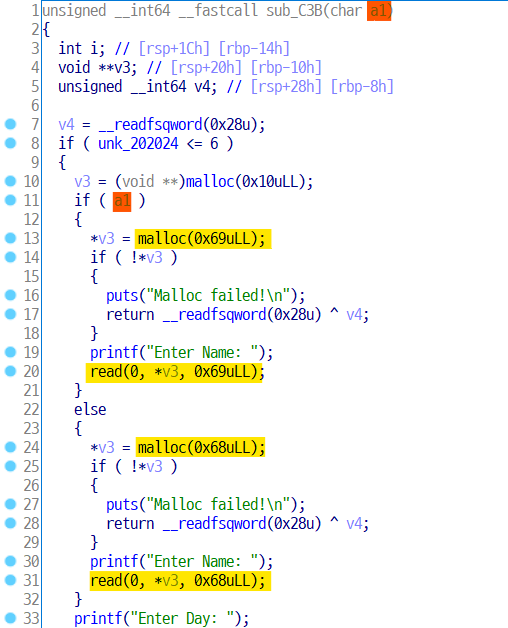 a1의 값이 참일 경우에는 malloc(0x69)를 하고 read(0, *v3, 0x69)를 한다.