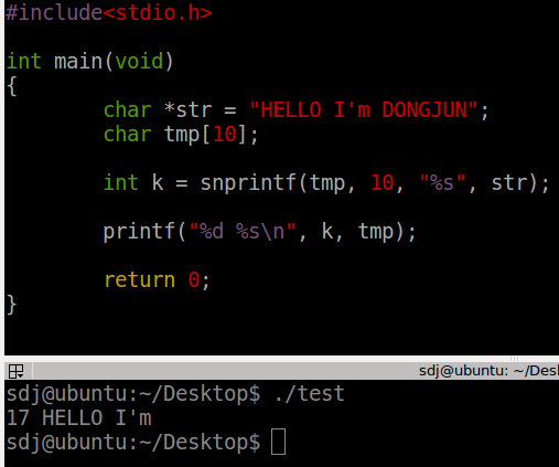 tmp[10]에 대해서 snprintf를 했을 때, 반환값은 str의 길이가 반환되는 것을 볼 수 있고, tmp배열에는 원하는 문자열만 들어간다.