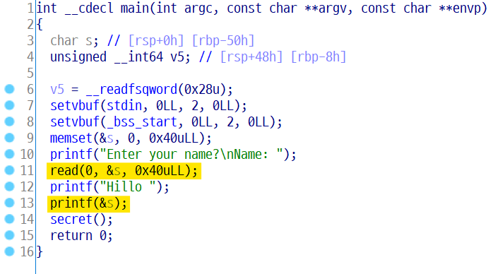 먼저 main을 보면 처음 노란 줄에서 s에 0x40만큼 입력을 받고 두 번째 노란 줄에서 출력을 해준다.