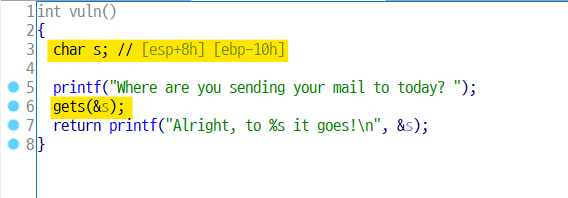 vuln()함수에서 gets(&s); 에서 bof가 발생한다.